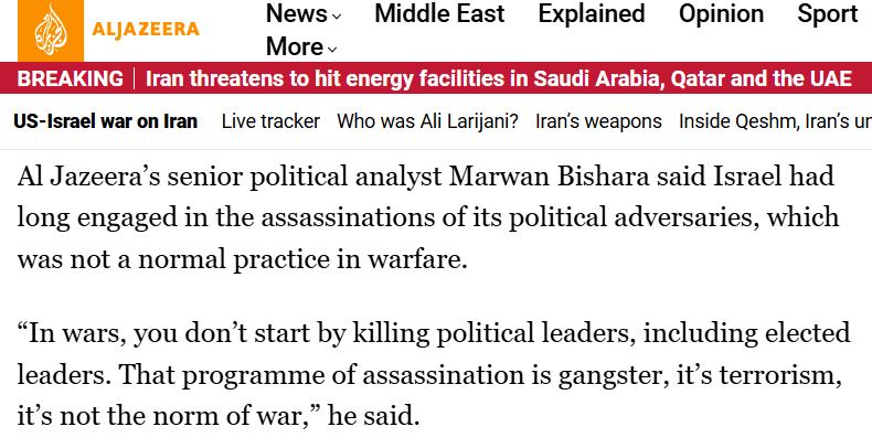 卡塔尔半岛电视台的评论认为,以色列长期以来一直对其政治对手实施暗杀,这不是战争中的正常做法。“那种暗杀计划是黑帮的,是恐怖主义的,不是战争的标准。”