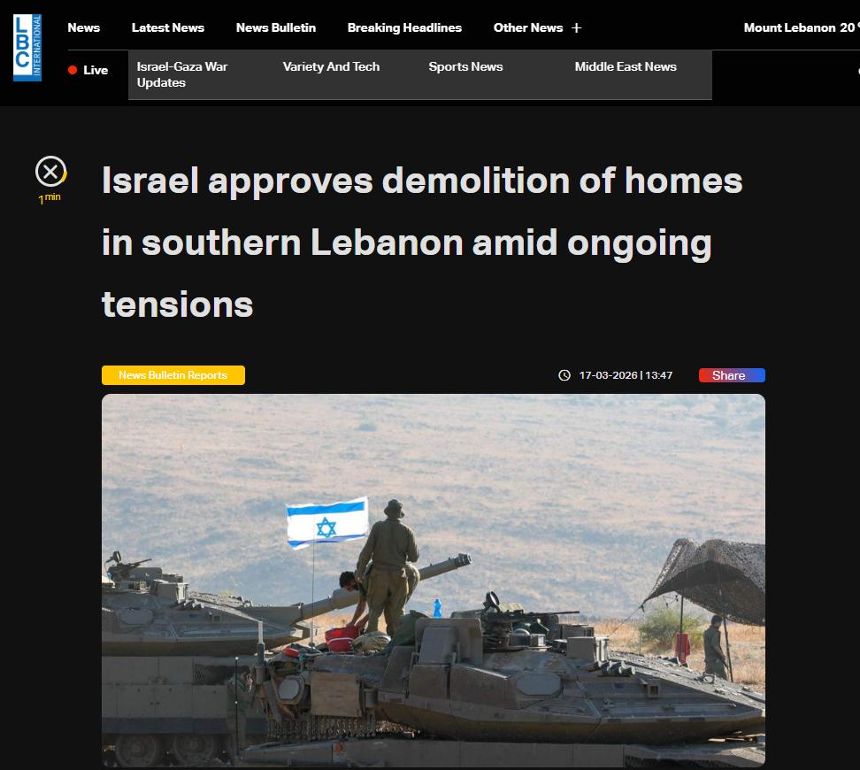 日前,黎巴嫩媒体报道,以色列内塔尼亚胡政府已批准了一项决定,拆除黎巴嫩南部前线村庄的所有房屋。
