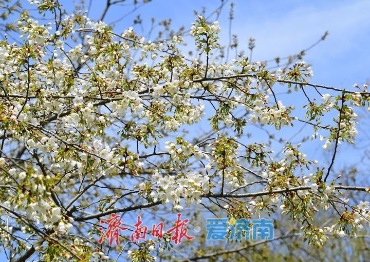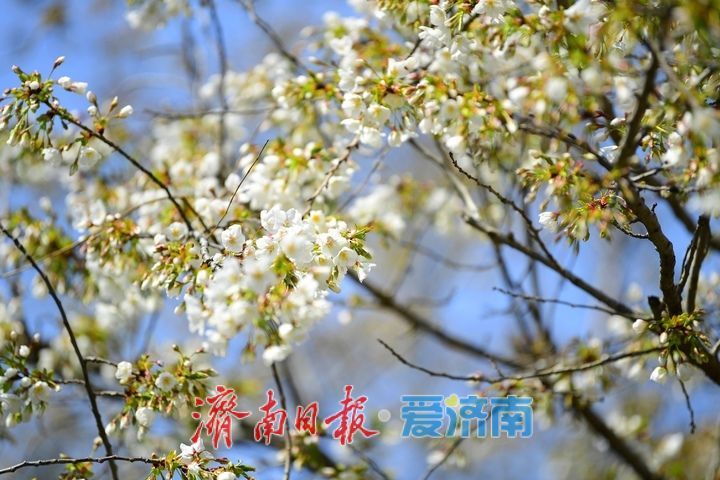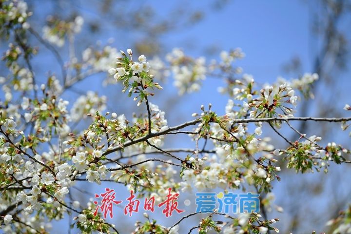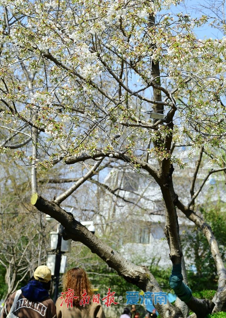3月19日,在济南五龙潭公园内的儿童戏水区东侧,一树樱花在春光中绽放洁白的身姿。