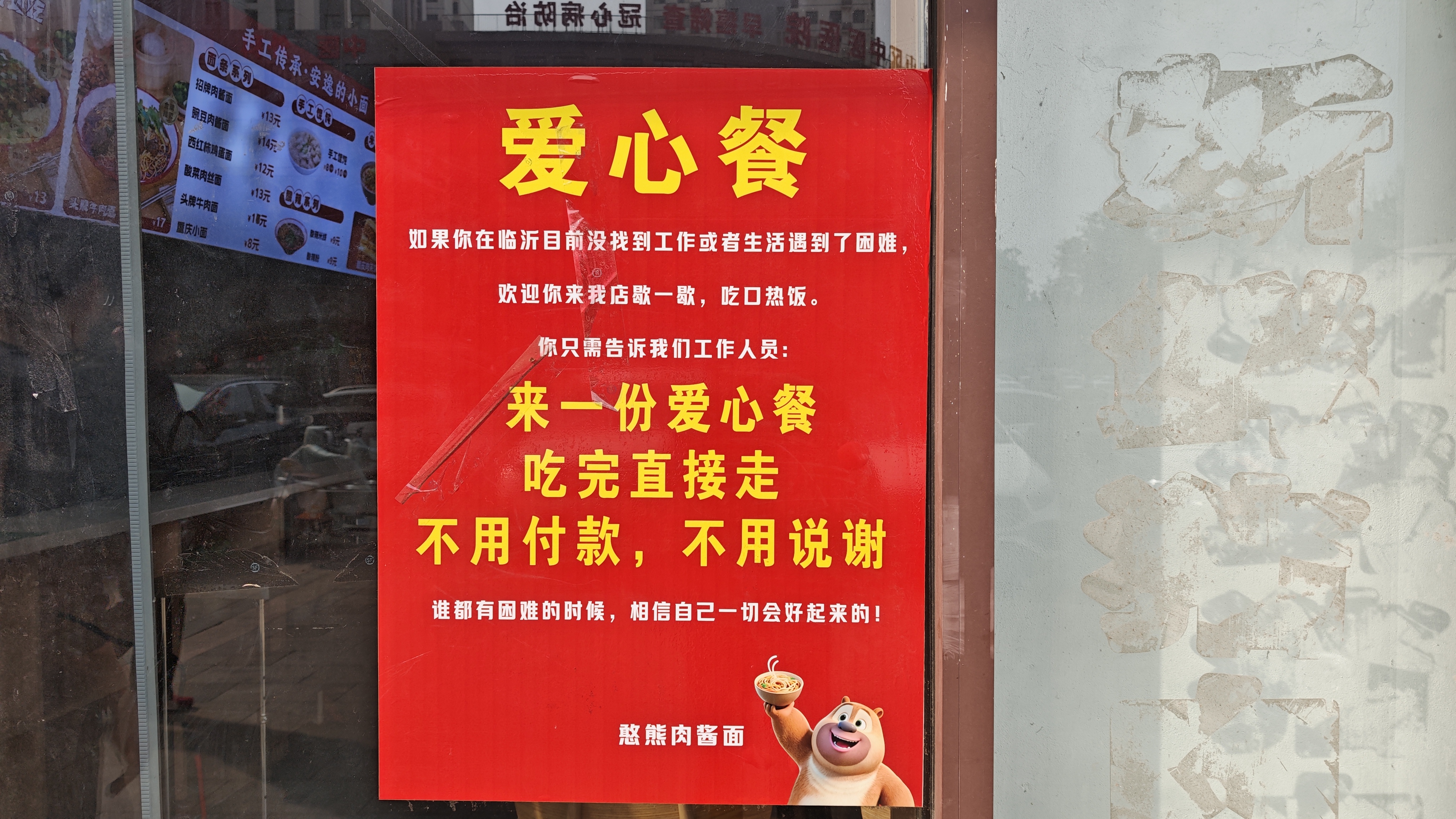 在临沂市工业大道与解放路交会路口西南角,一家名为“憨熊肉酱面”的小店门口,贴着一张普通的红纸。上面的内容却让无数路人为其点赞:“如果你在临沂目前没找到工作或者生活遇到了困难,欢迎你来我店歇一歇,吃口热乎饭。你只需告诉我们工作人员:来一份爱心餐,吃完直接走,不用付款,不用说谢……”