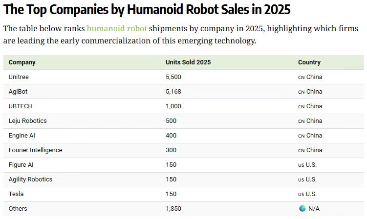 2025年,特斯拉交付了150辆Optimus,预计将于2027年开始公开销售。同样,其他美国领先公司 Figure AI 和 Agility Robotics 的出货量也大致相同。尽管迄今为止交付量有限,Figure AI 的估值仍飙升至 390 亿美元,远高于 2024 年的 26 亿美元。中国凭借完善的供应链体系、核心技术自主化突破及多场景落地优势,稳居全球人形机器人产业第一大国。