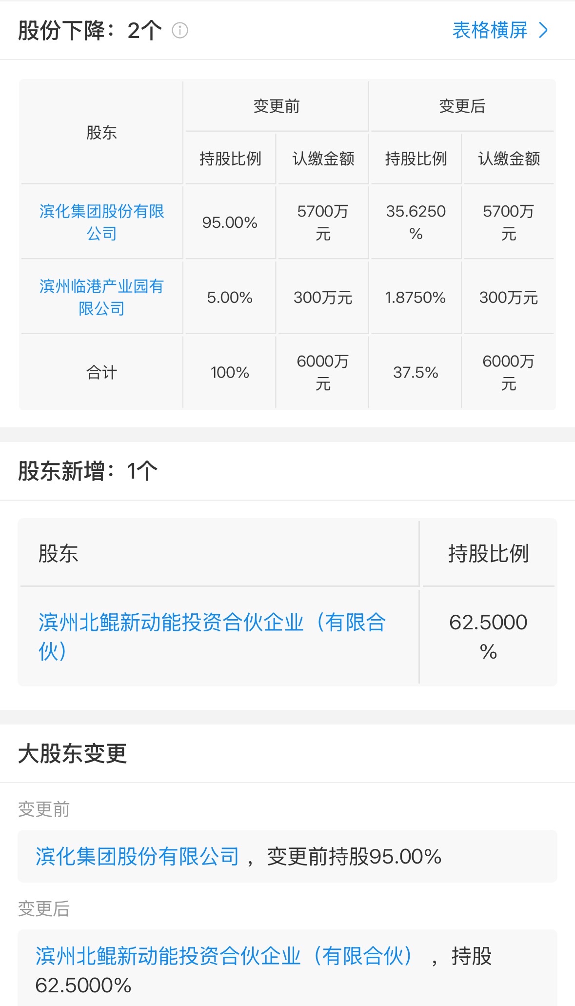 企查查显示,3月19日,滨州蓝润环境资源有限公司(下称“蓝润环境”)大股东由滨化股份(601678.SH)变更为滨州北鲲新动能投资企业(有限合伙)(下称“北鲲新动能”),持股比例由95%降至35.625%,北鲲新动能以62.5%持股比例成为控股股东。原股东滨州临港产业园有限公司持股比例由5%降至1.875%。