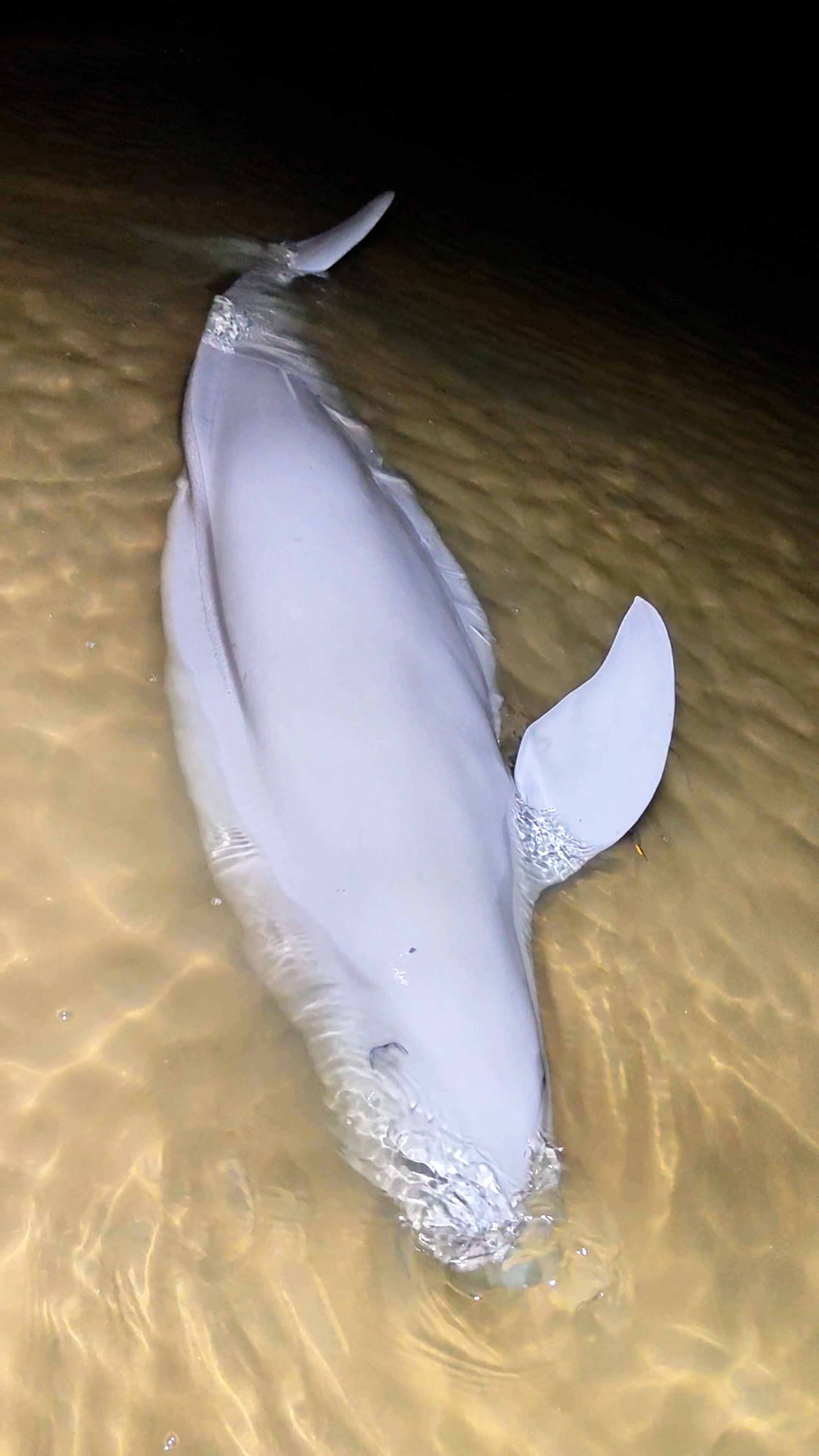 据赵志华回忆,当时正值涨潮后约30分钟,他在滩涂捡拾猫耳螺时,远远发现滩涂中央有一个“大家伙”,走近后才确认是一头搁浅的江豚。这头江豚为罕见的白色,目测体长超3米,体重约三四百斤,尾巴有明显旧伤,腹部隆起疑似怀孕,身体大部分露出水面,头顶呼吸孔清晰可见,好在除旧伤外无其他明显伤痕,整体状态良好。