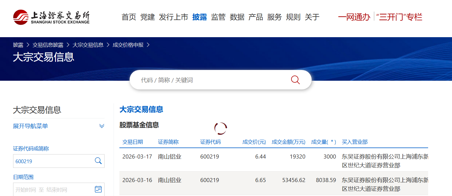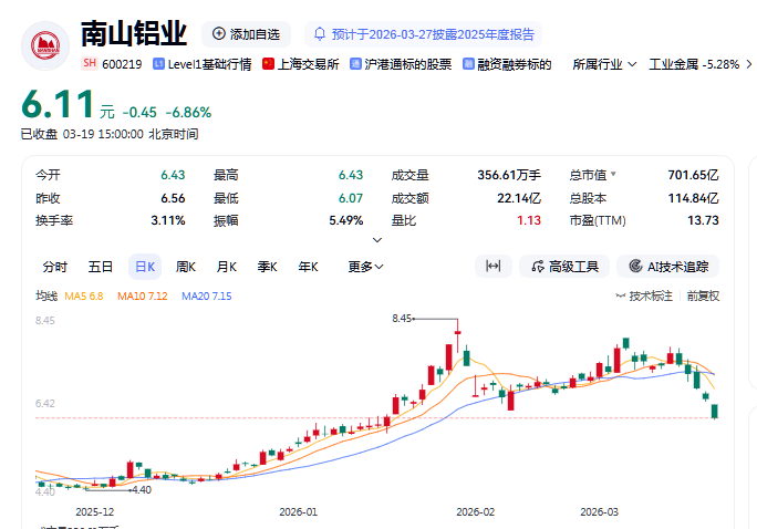 截至3月19日收盘,南山铝业报收6.11元/股,较前一交易日下跌6.86%,3月18日至19日两个交易日累计跌幅超10%。