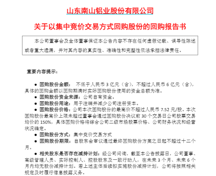 与股东大额减持形成鲜明反差的是,南山铝业同期正在推进股份回购计划。前述1月14日披露的回购报告书显示,公司拟以自有资金回购公司股份,用于注销并减少公司注册资本,回购资金总额不低于3亿元且不超过6亿元,回购股份价格不超过7.52元/股。
