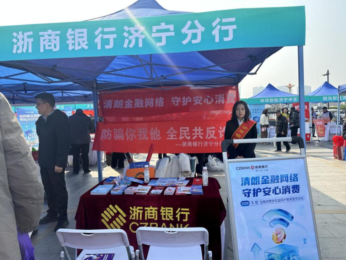 3月13日上午,浙商银行济宁分行积极参加由济宁市银行业协会在太白楼中路文化广场举办的2026年济宁辖区“3·15”金融消费者权益保护教育集中宣传活动,与全市各银行机构共同营造安全清朗的金融消费环境。