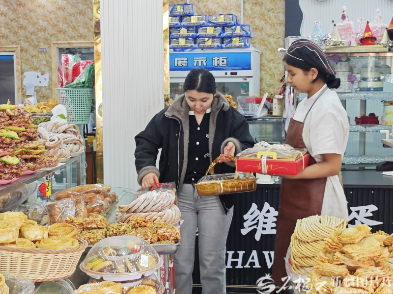 新疆各地州市消费市场同样火爆,巴楚县各大商超备足货源,干果、糕点热销。在某甜品店内,各式干果、糕点、糖果摆满货架,吸引不少群众驻足选购。“今天来挑些甜点,带回家和家人分享,一家人开开心心过节。”居民夏依达·肉孜笑着说。