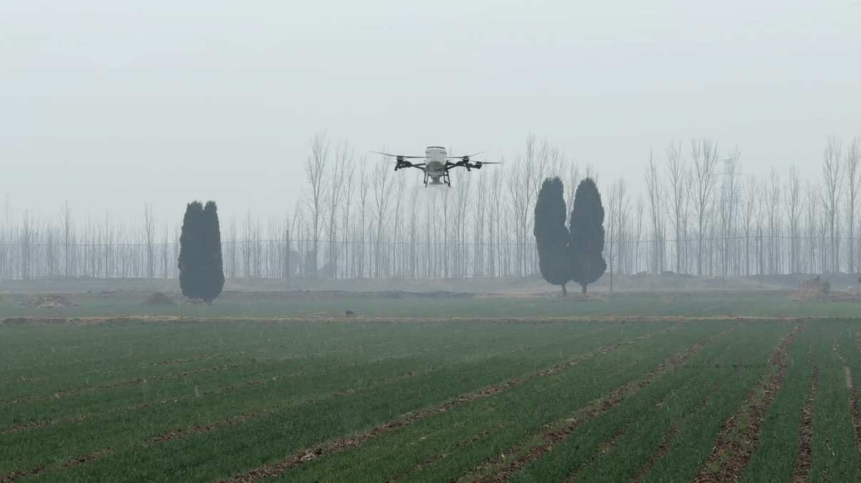 “呼呼呼——”呼啸声由远及近,一架无人机从他面前调了个头又飞走了。灯光下可以隐约看见,化肥颗粒被甩盘均匀地抛撒出来,和绵绵细雨一起落进麦田,润物无声。