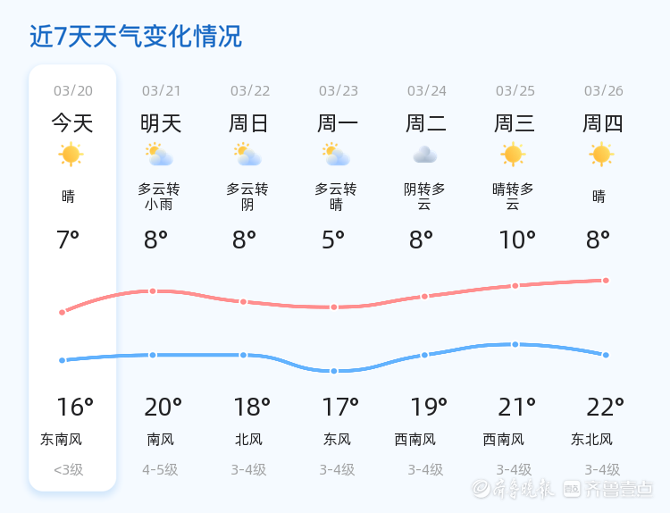 未来三天,德州天气以多云为主,局部地区可能出现阴天和小雨。气温波动较大,最高气温可达20℃,最低气温5℃。22日和23日风力较大,北风和东风3-4级,市民应注意防范大风天气带来的不利影响,如妥善安置易受风影响的物品。