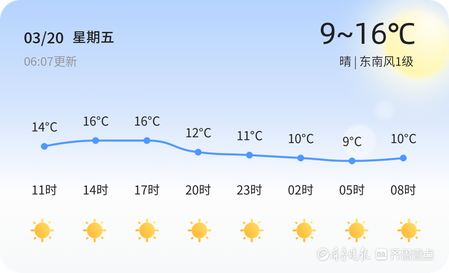 今天是3月20日,星期五,农历二月初二。今天是二十四节气中的春分,标志着昼夜平分,天气逐渐转暖。聊城市今日天气晴朗,气温在9℃至16℃之间,东南风1级,空气湿度84%,PM2.5指数96。全市各区天气情况基本一致,均为晴朗天气,适合市民外出活动。