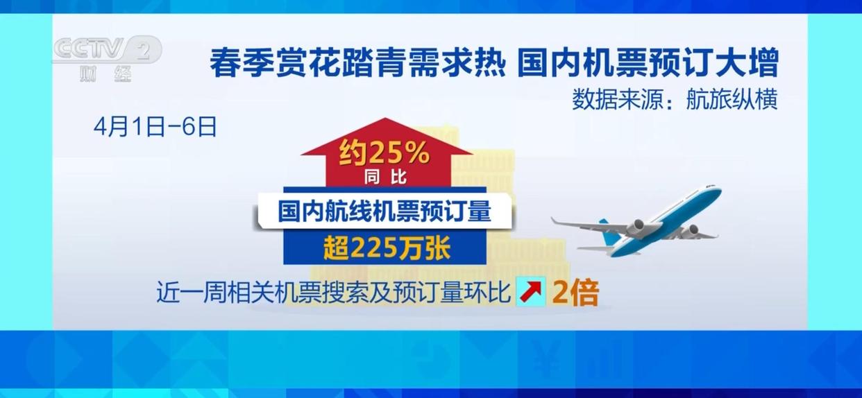 数据显示,截至目前,4月1日至6日国内航线机票预订量超225万张,同比增长约25%,近一周相关机票搜索及预订量环比上涨2倍。