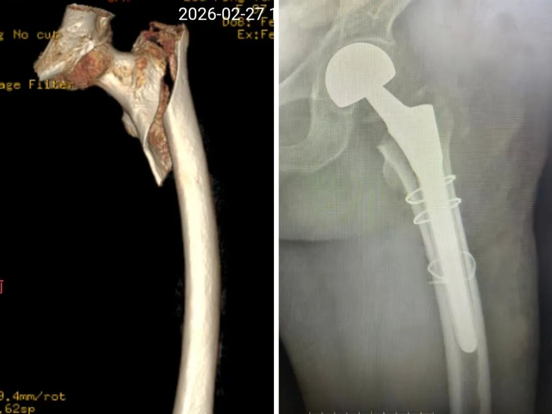 患者年事已高,且合并心力衰竭、支气管炎、冠心病等多种基础疾病,身体耐受度差,手术及麻醉风险极高。若采用传统内固定手术,不仅骨折愈合周期长,长期卧床还极易引发肺部感染、深静脉血栓等严重并发症。为避免长期卧床带来的风险、促进早期功能恢复,科室团队充分评估患者全身情况,量身定制人工股骨头置换术个体化方案。在麻醉手术科、心病科、肺病科、针灸科及输血科等多学科协作下,手术顺利实施。术后经医护团队精心治疗与护理,老人恢复良好,出院前已能实现床旁站立,生活质量显著改善。