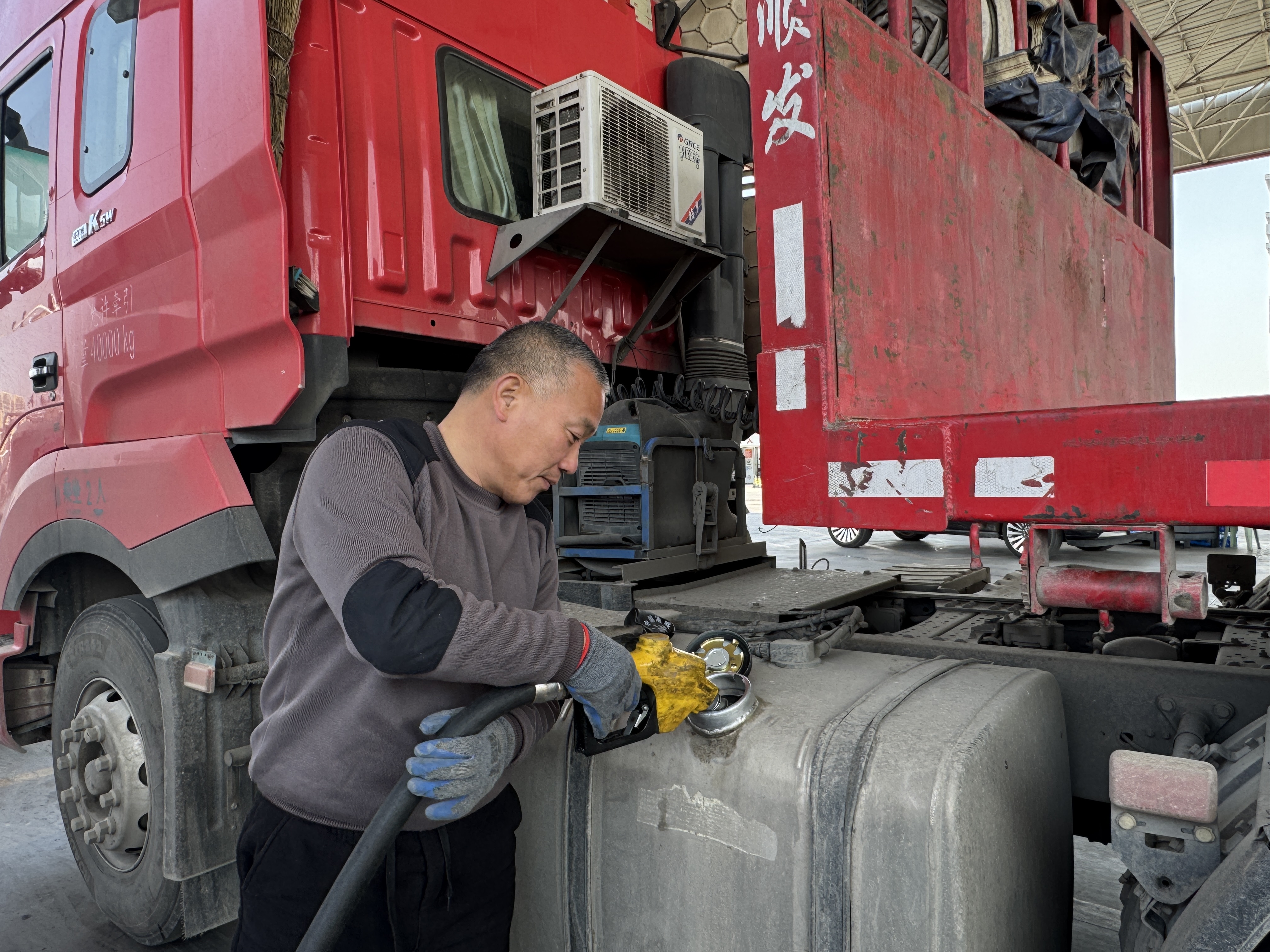 正在加油的货车司机,担心油价一天多变,只要油箱空着就加上。