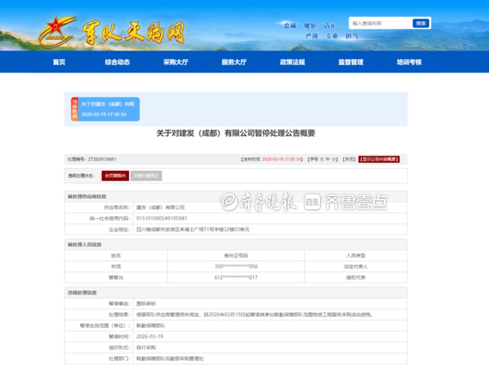 公告显示,建发(成都)有限公司(统一社会信用代码:9151010005491959X1)因“围标串标”,违反了军队供应商管理相关规定。根据处理结果,自2026年3月19日起,该公司将被暂停参加联勤保障部队范围物资、工程、服务采购活动的资格。处理部门为联勤保障部队后勤部采购管理处。一同被处理的还包括该公司的法定代表人林茂,以及授权代表蔡智光。