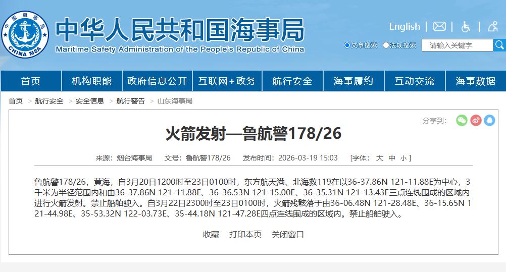 航行警告!黄海海域有火箭发射央视军事 2026-03-20 09:45:36据中国海事局网站消息,烟台海事局发布航行警告,3月20日12时至23日1时,黄海部分海域进行火箭发射,禁止船舶驶入。 (央视军事)责任编辑:朱洪蕾