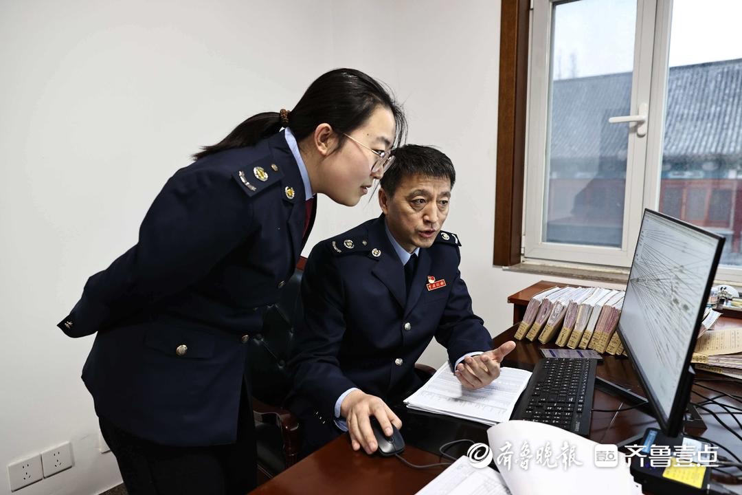 于正波和同事并肩协作研判涉税数据,对照报表与系统信息。