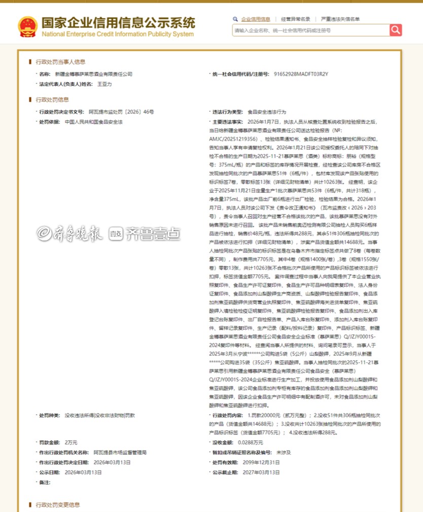 鉴于上述违法事实,阿瓦提县市场监督管理局认定该行为违反了《中华人民共和国食品安全法》相关规定。依据该法,监管部门责令当事人停止违法行为,并作出如下行政处罚:罚款人民币20000元(贰万元整);没收抽检同批次不合格产品51件(306瓶),货值14688元;没收涉案产品所使用的标识标签10263张,货值7705元;没收违法所得288元。处罚决定日期为2026年3月13日,公示截止期为2027年3月13日。