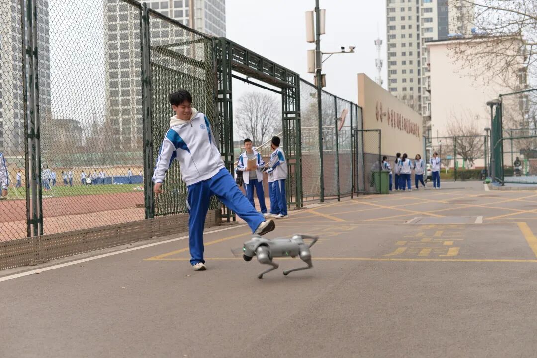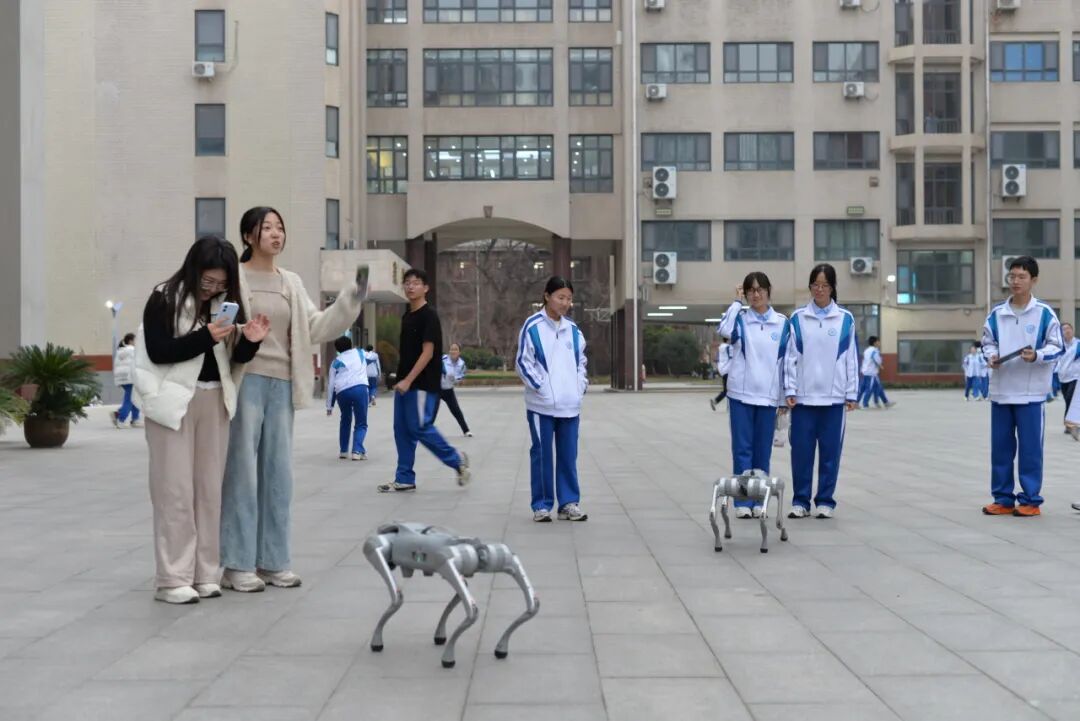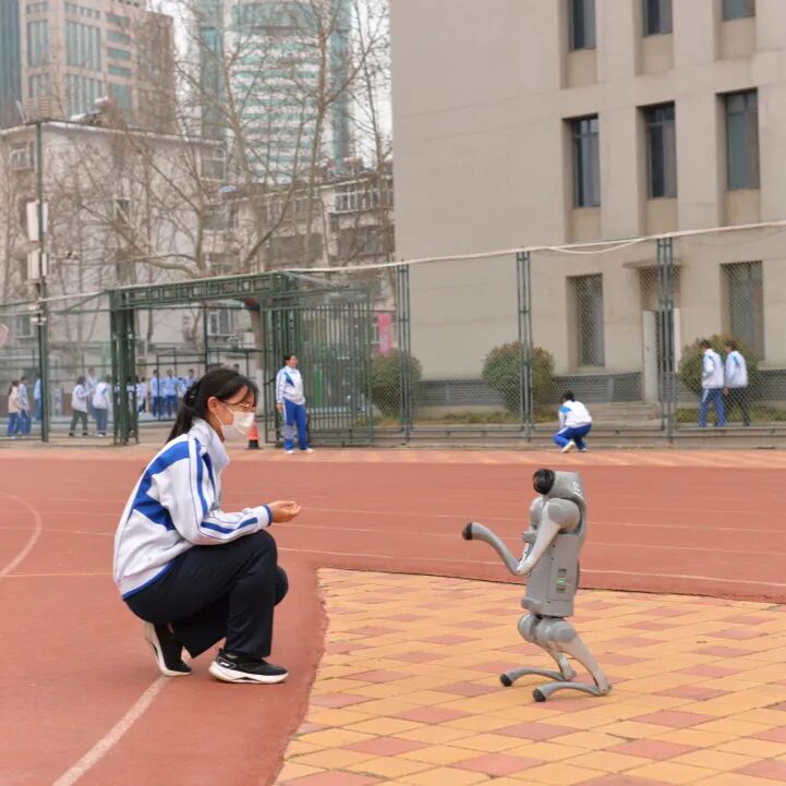 活动在田径场开启,机器狗展示了站立、行走、转向、下蹲、起身等基础动作,并演示了简单语音/手势互动,与同学们比拼跑步、互相拜年握手,构成一幅人与机器交互的科技感画面。