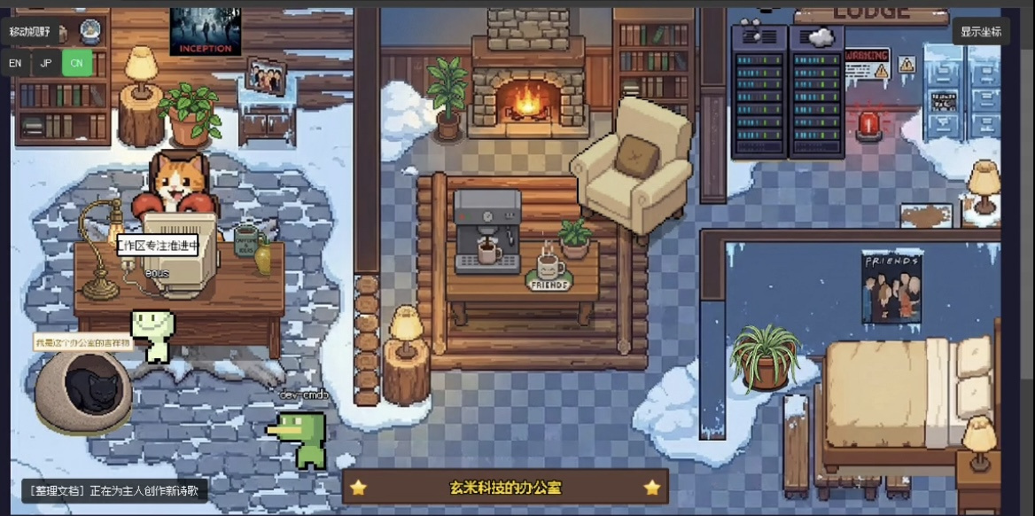 在后台代码指令框中输入“请帮我写一首文字优美的现代诗”的指令后,网页上的虚拟办公空间内,原本躺在沙发上喝咖啡的小猫咪走向办公桌,举起龙虾钳子开始在电脑前打字,一旁显示“进入专注模式:勿扰”的字样。