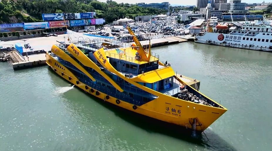 船上空间焕新,统一视觉形象,优化软装内饰,铺装海洋主题打卡墙,推出手绘海图、海洋咖啡杯等数十种专属文创,推动演出、非遗、文创和数字产品上船,让游船化身为移动的海洋休闲客厅,如蓬莱面塑、葫芦雕刻技艺等非遗特色商品深受广大游客的喜爱。自2025年7月底首航以来,旺季期间平均上座率超过80%,实现安全零事故、旅游零投诉,取得了良好的经济效益和社会效益。