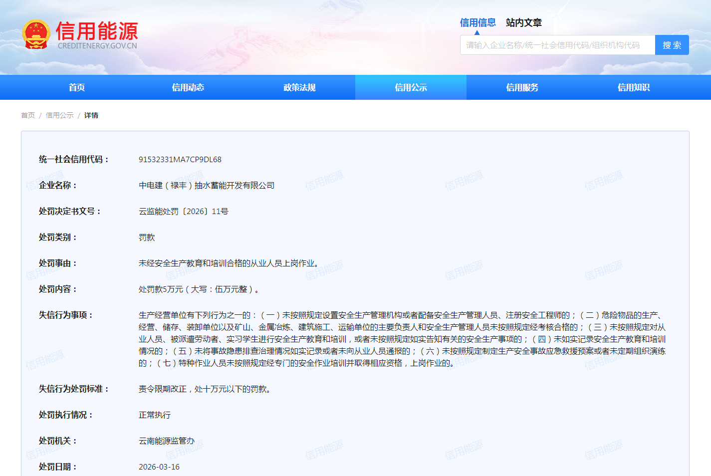 近日,信用能源公示了中电建(禄丰)抽水蓄能开发有限公司的行政处罚决定。处罚决定书文号云监能处罚〔2026〕11号显示,处罚事由为未经安全生产教育和培训合格的从业人员上岗作业。根据相关规定,云南能源监管办对其作出罚款5万元处罚。
