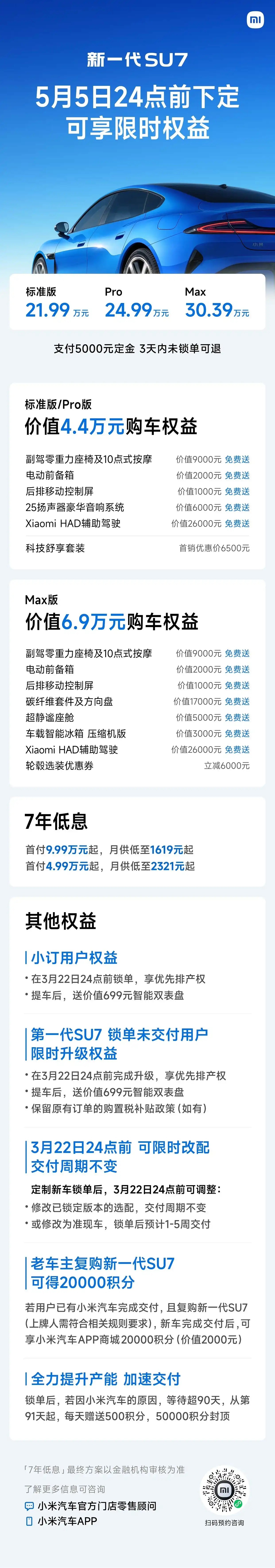 根据小米方面公布的信息,19日晚21:30开启下定,定金5000元,3天内未锁单可退。5月5日24点前下定,可享限时权益。3月22日24点前,可限时改配,交付周期不变。小订用户、第一代SU7限时升级用户,锁单后可享优先排产权。