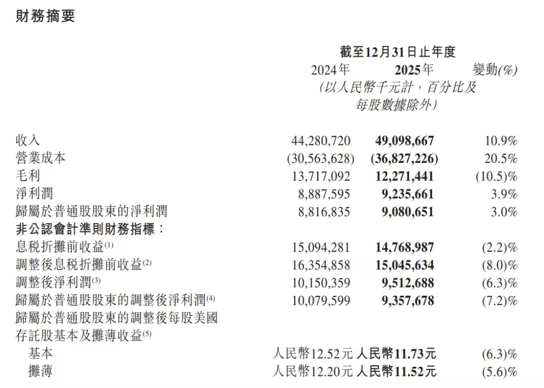 财报显示,中通快递2025年实现营业收入490.99亿元,同比增长10.9%;毛利为122.7亿元,同比下降10.5%;营业利润为104.7亿元,同比下降11.1%;净利润为92.36亿元,同比增长了3.9%;调整后净利润为95.13亿元,同比减少6.3%。