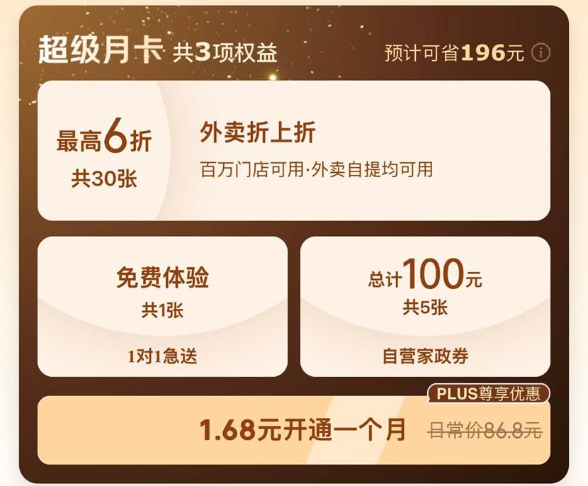3月20日,京东外卖于上线一周年之际,宣布正式推出“外卖超级月卡”。这是京东外卖首款跨场景生活权益产品,特色是“三合一”,整合外卖自提、即时配送、家政服务权益于一体,包含30张外卖折扣券+1次1对1急送免费体验+京东家政100元券包,可满足用户日常生活核心需求。该月卡日常价86.8元,上新期售价为6.18元,PLUS会员和外卖新用户仅需1.68元,旨在以低门槛实现“一单回本”的高频实用价值。