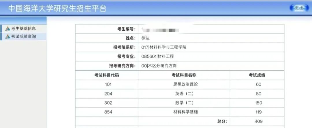 山东理工大学材料科学与工程学院材本2202班徐达,报考中国海洋大学,数学(二)150分,英语(二)80分,总分409,专业排名第4。