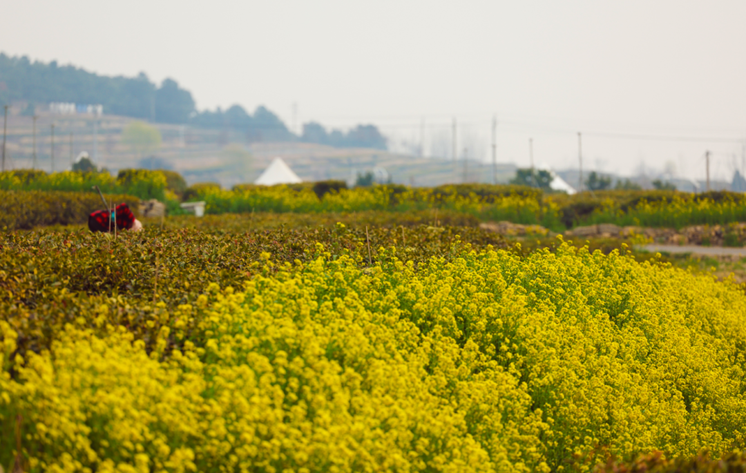 不远处的油菜花田悄然盛放,嫩黄的花穗簇拥成海,微风拂过,花浪翻涌,与茶园的翠绿相映成趣,勾勒出清新雅致的春日田园图景。