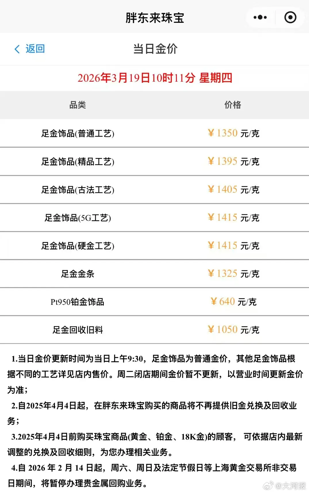 胖东来金饰克价跌至1315元,足金金条克价一夜跌60元