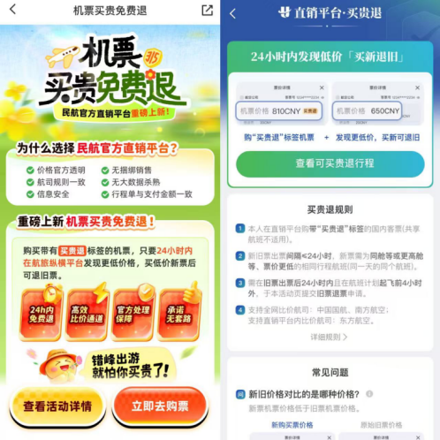 3月29日将进行航班换季,机票价格变化较快,部分航线在购票后可能出现降价的情况。近期,为维护旅客权益,三大航推出机票“买贵免费退”服务,旅客可在航旅纵横民航官方直销平台购买带有“买贵退”标识的机票产品,若在出票后24小时之内发现同一航班的机票更便宜,即可购买便宜的机票,并通过航旅纵横APP内专属服务页面提交退旧票申请。最后建议旅客在购买机票后,使用航旅纵横机票验证服务,以此进行客票验真以及票价税费查询。