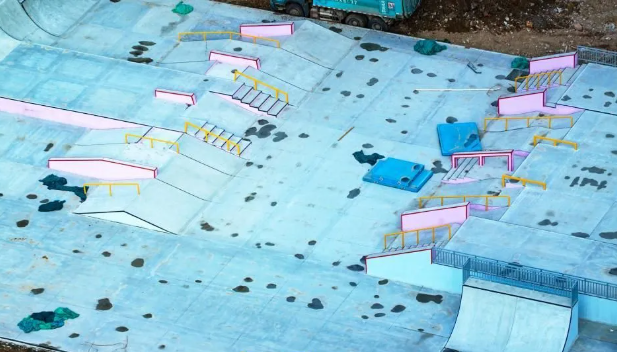 在施工区域内,波浪起伏的滑板赛道轮廓清晰可见,配套建筑主体也已建成。