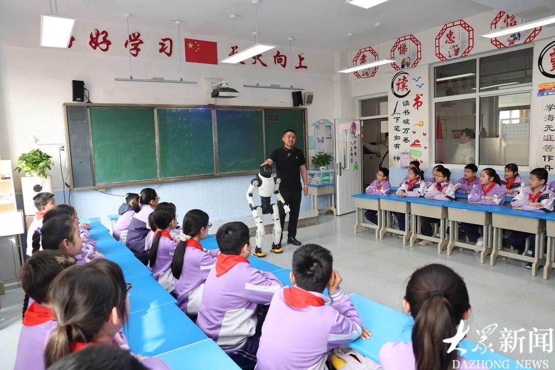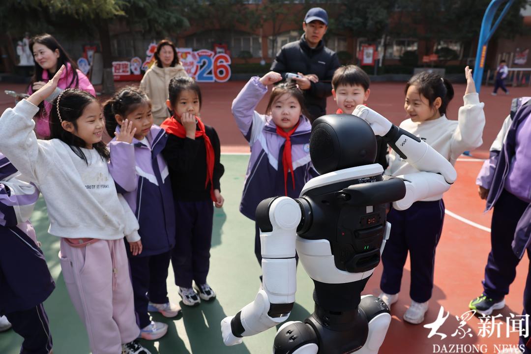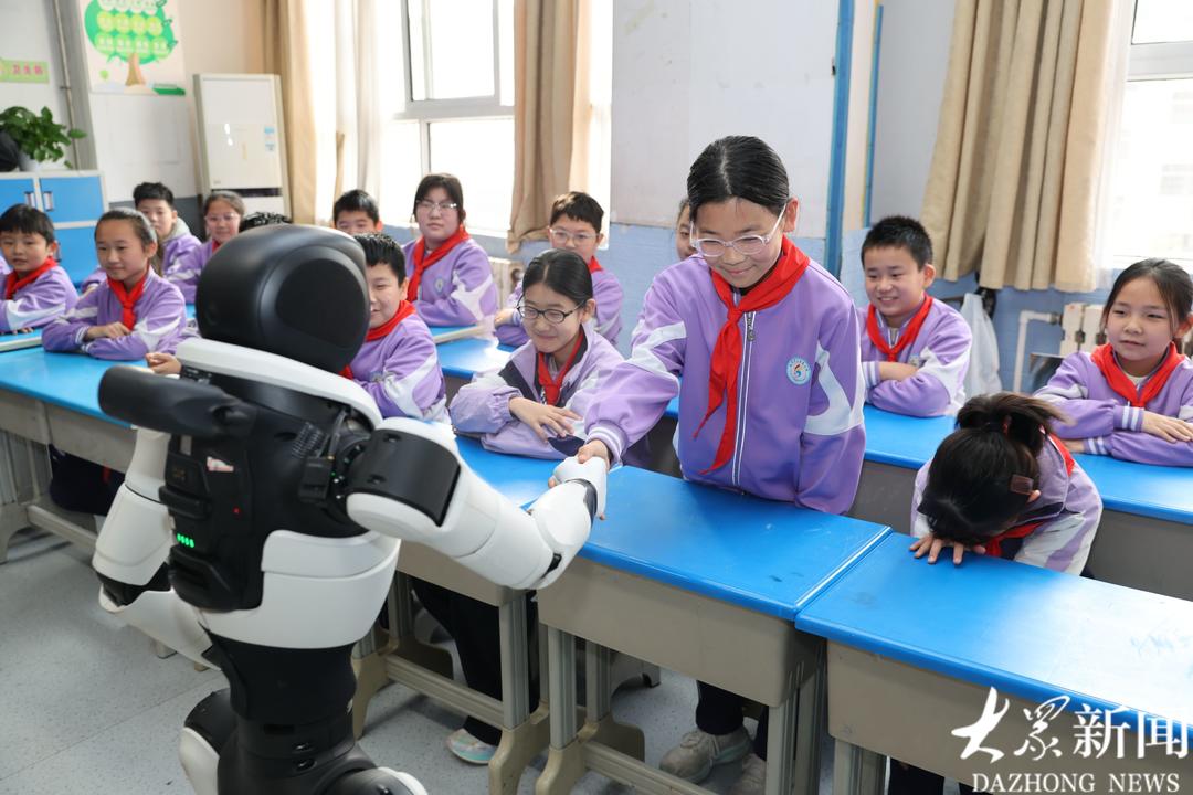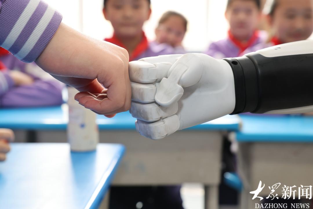 3月12日,位于临沂市兰山区金雀山街道的临沂第三实验小学,五年级八班教室,小学生与人形机器人碰拳握手、“亲密接触”。