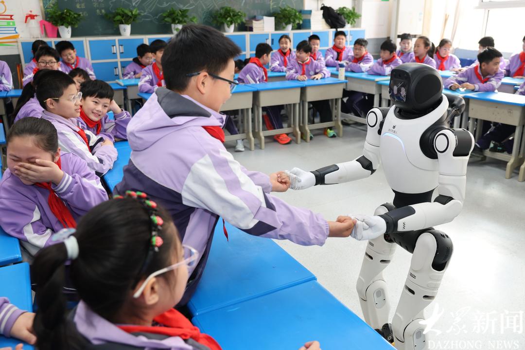 科普活动完成,人形机器人与小学生互致敬礼,孩子们簇拥着欢送给他们带来科学乐趣的机器人。