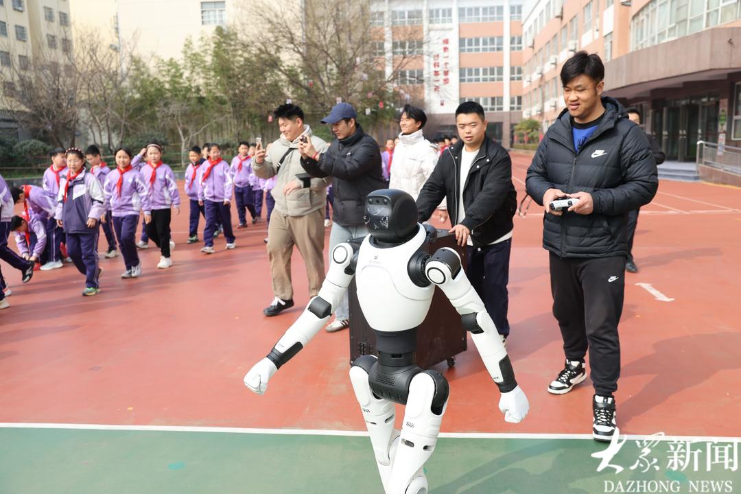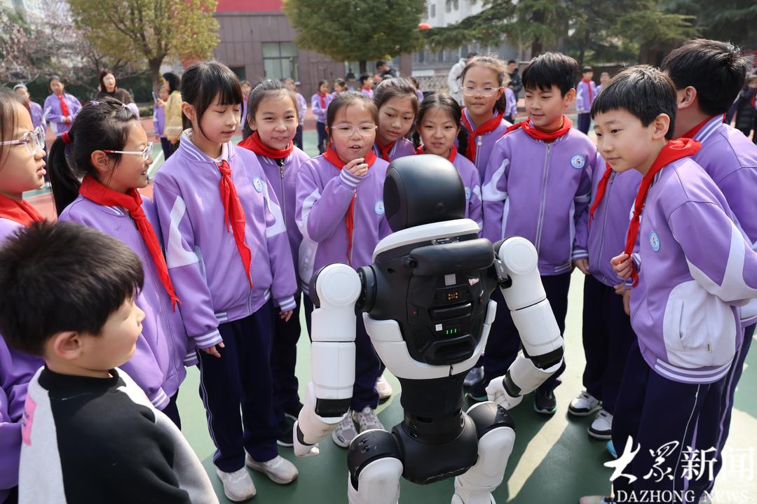 科普活动户外环节,工作人员操控人形机器人走到操场上,更多的小学生参与进来,机器人与小学生互动,进行英语会话。
