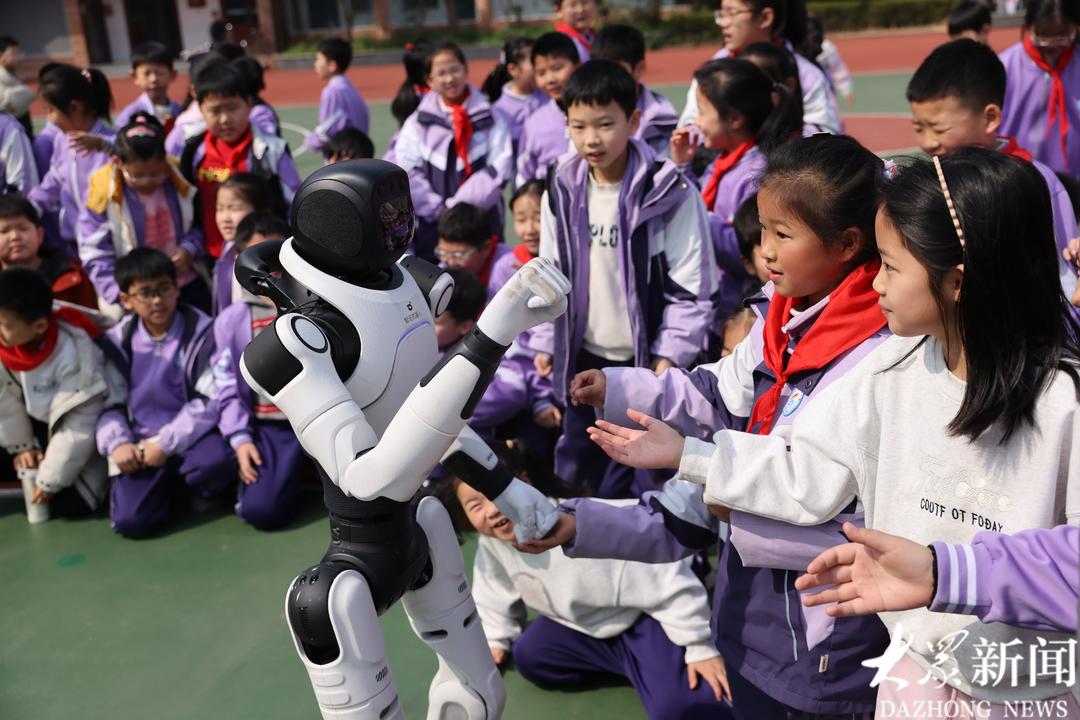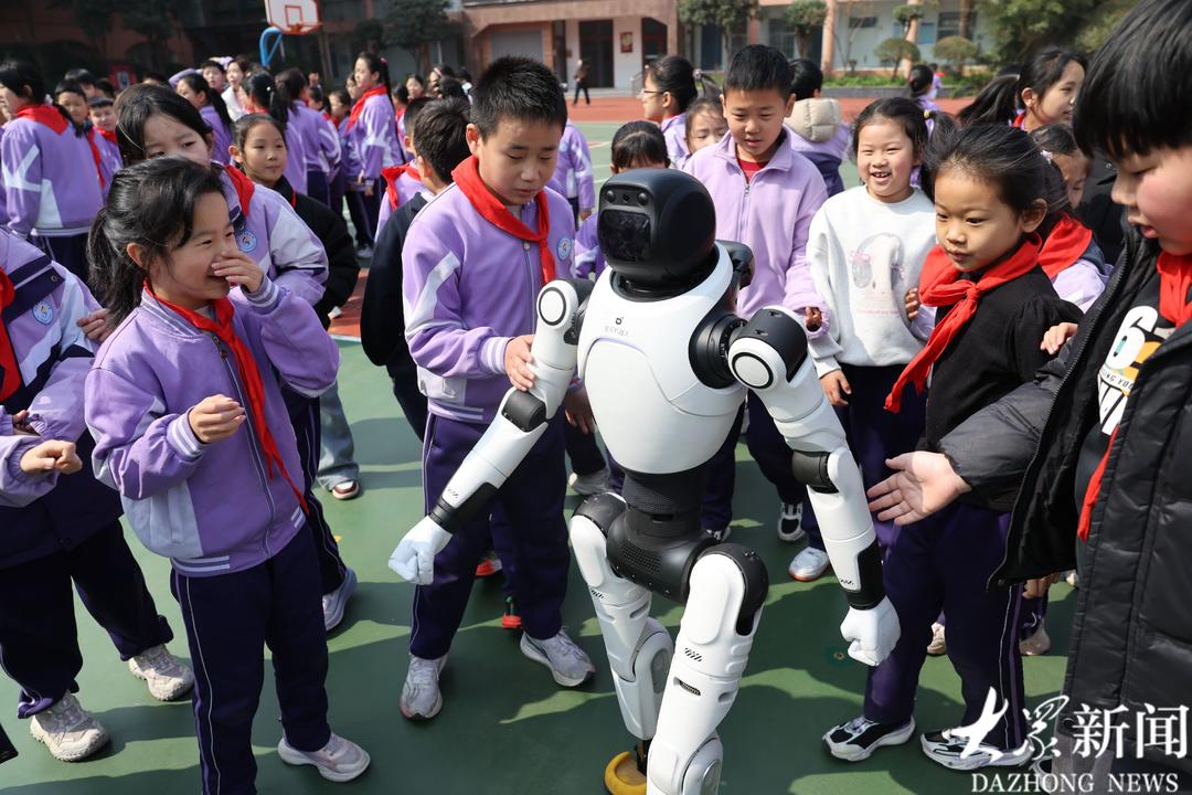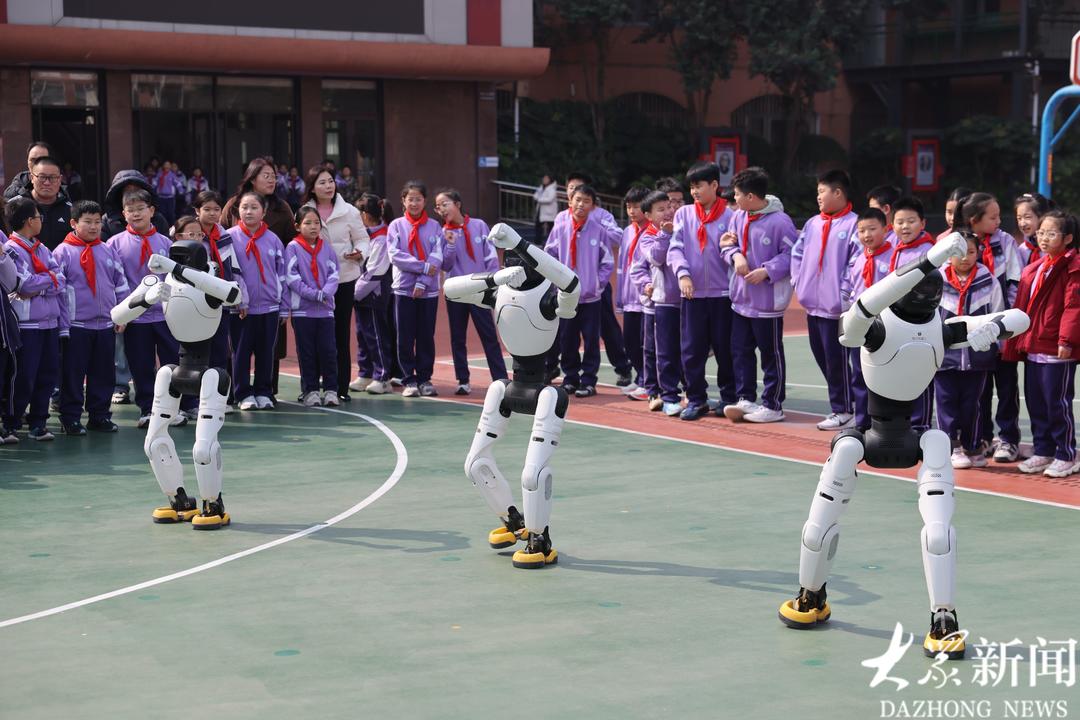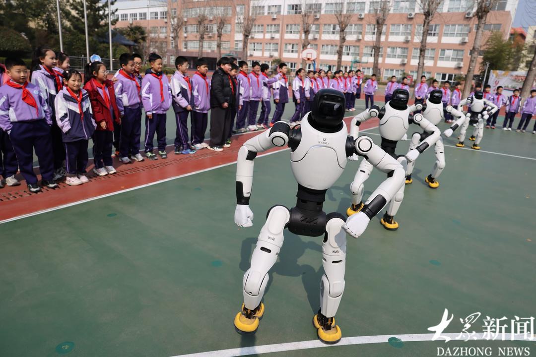 人形机器人列队为小学生表演舞蹈和武术,围观的学生不禁模仿起机器人的动作。