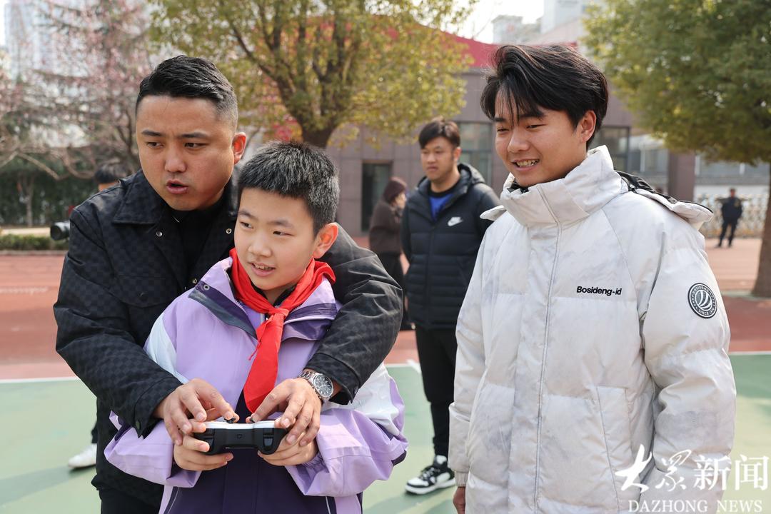工作人员和机器人来自临沂当地的多米智航(山东)电子科技有限公司,当天,他们和学校联合举办了一场公益机器人科普活动。
