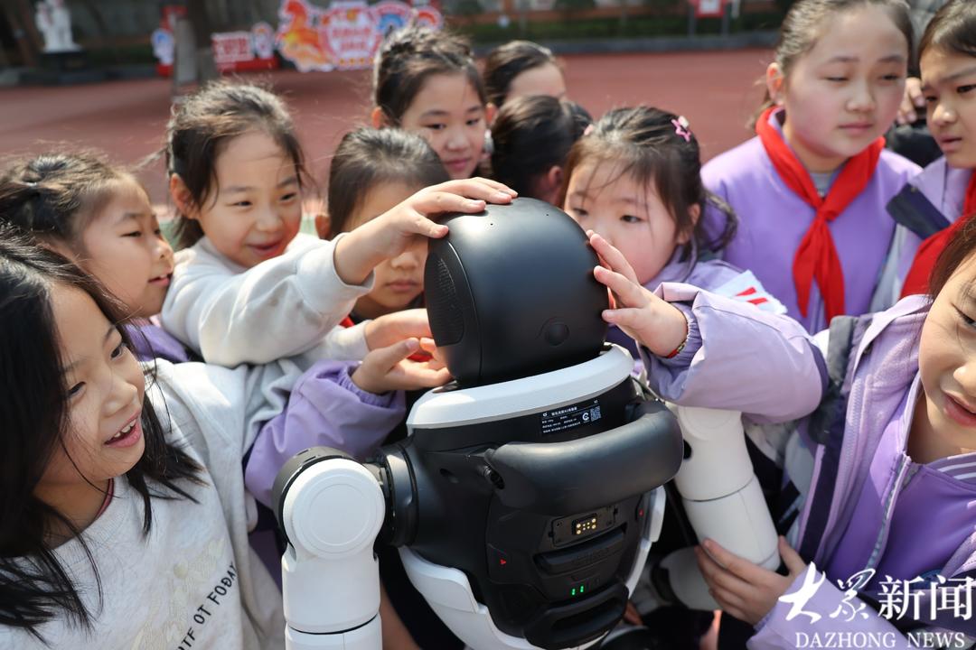 科普活动现场,机器人表演结束后,小学生一拥而上,围观抚摸人形机器人,与其对话互动。