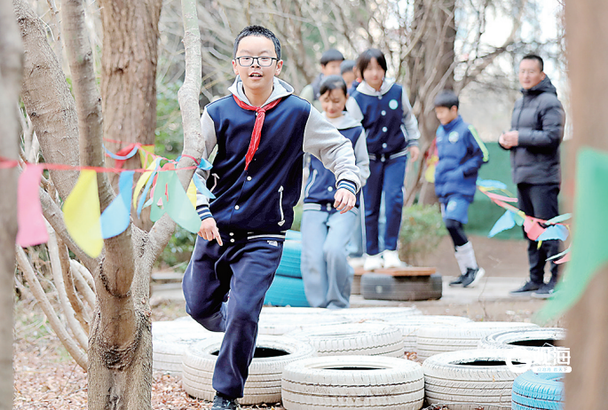 3月17日下午,大课间铃声响起,青岛香港路小学的校园瞬间“沸腾”,孩子们争先冲向教学楼南侧的“丛林障碍穿越区”——这里俨然成了一处微缩版的“练兵场”,学生们猫着腰穿过低空绳网,如同小战士“穿越火线”;在平衡木上,他们张开双臂,小心翼翼地挪步,仿佛走在山间的独木桥上;在轮胎阵里,大家连蹦带跳,手脚并用,欢笑声和加油声此起彼伏……