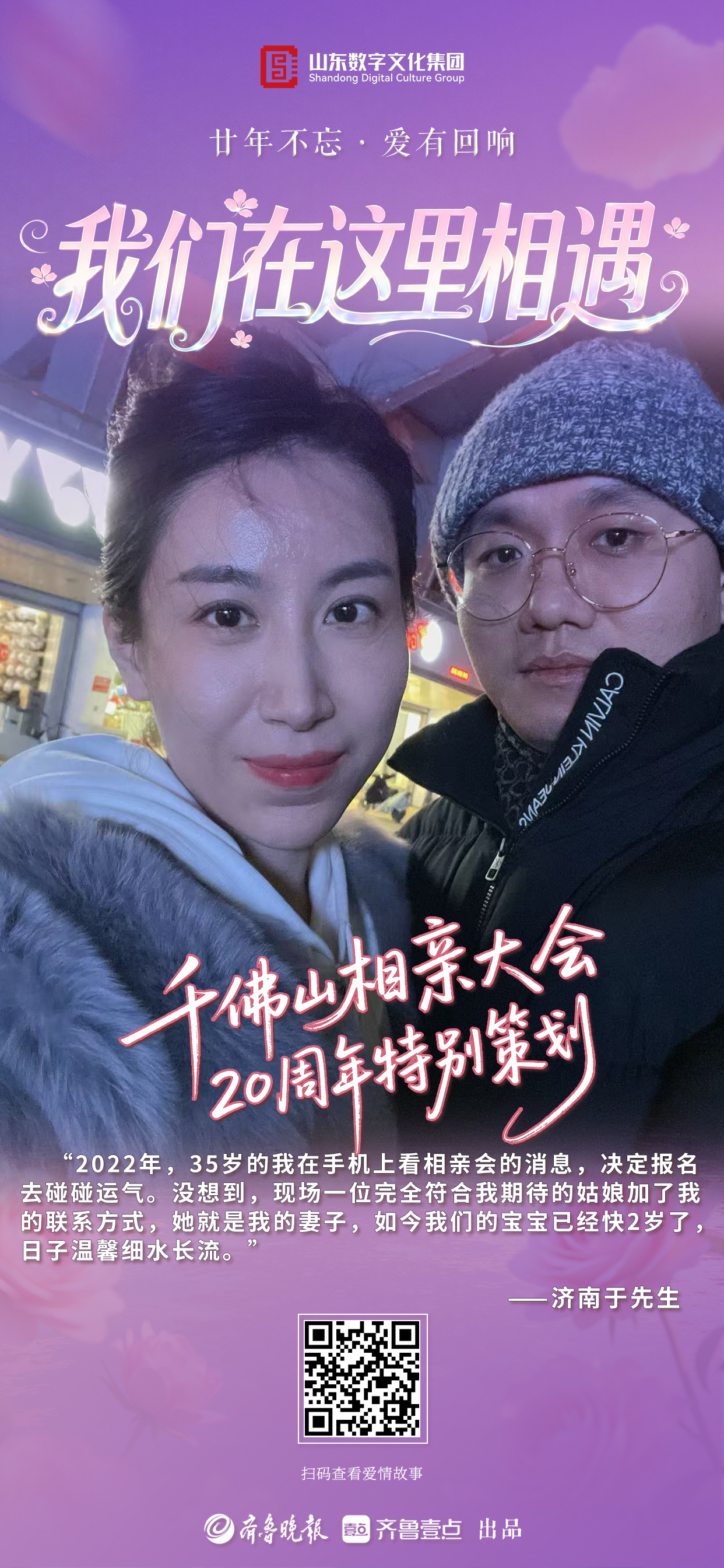 从2006到2026,二十年岁月如歌,二十年只为相遇。值此千佛山相亲大会二十周年之际,齐鲁晚报·齐鲁壹点推出“廿年不忘·爱有回响”千佛山相亲大会二十周年特别策划,向通过相亲会结缘另一半组建幸福美满家庭的无数个有缘人发出诚挚邀请,在二十周年这个特别的日子里,一起分享我们在这里相遇的故事,共忆动心时刻,共叙相守温情。