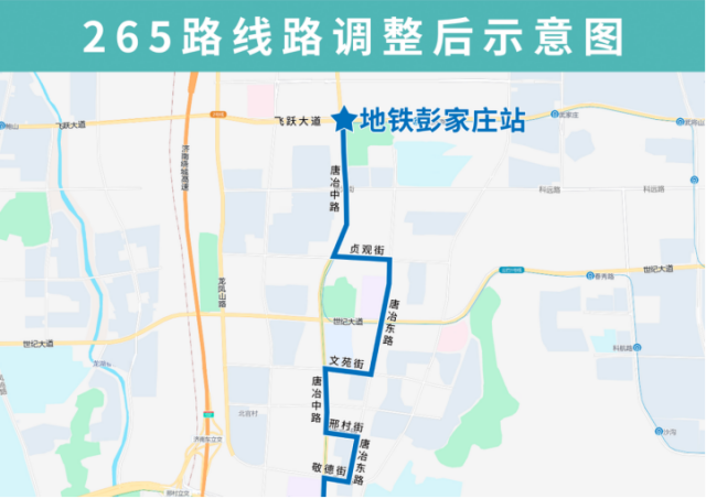 济南265路公交由地铁彭家庄站开往历城区委党校,3月21日优化调整后,沿飞跃大道向西、唐冶中路向南、贞观街向东、唐冶东路向南、文苑街向西、唐冶中路向南、邢村街向东至唐冶东路向南恢复原线,沿途增设地铁历城二中唐冶校区站、云巴贞观街站(路东)、历城工人文化宫、文苑街唐冶中路、唐冶中路幼安街、邢村街唐冶中路(路南)、地铁唐冶公园站(路东)、唐冶公园南门站点,撤销历城二中、贞元街唐冶中路、唐冶公园等3个站点。