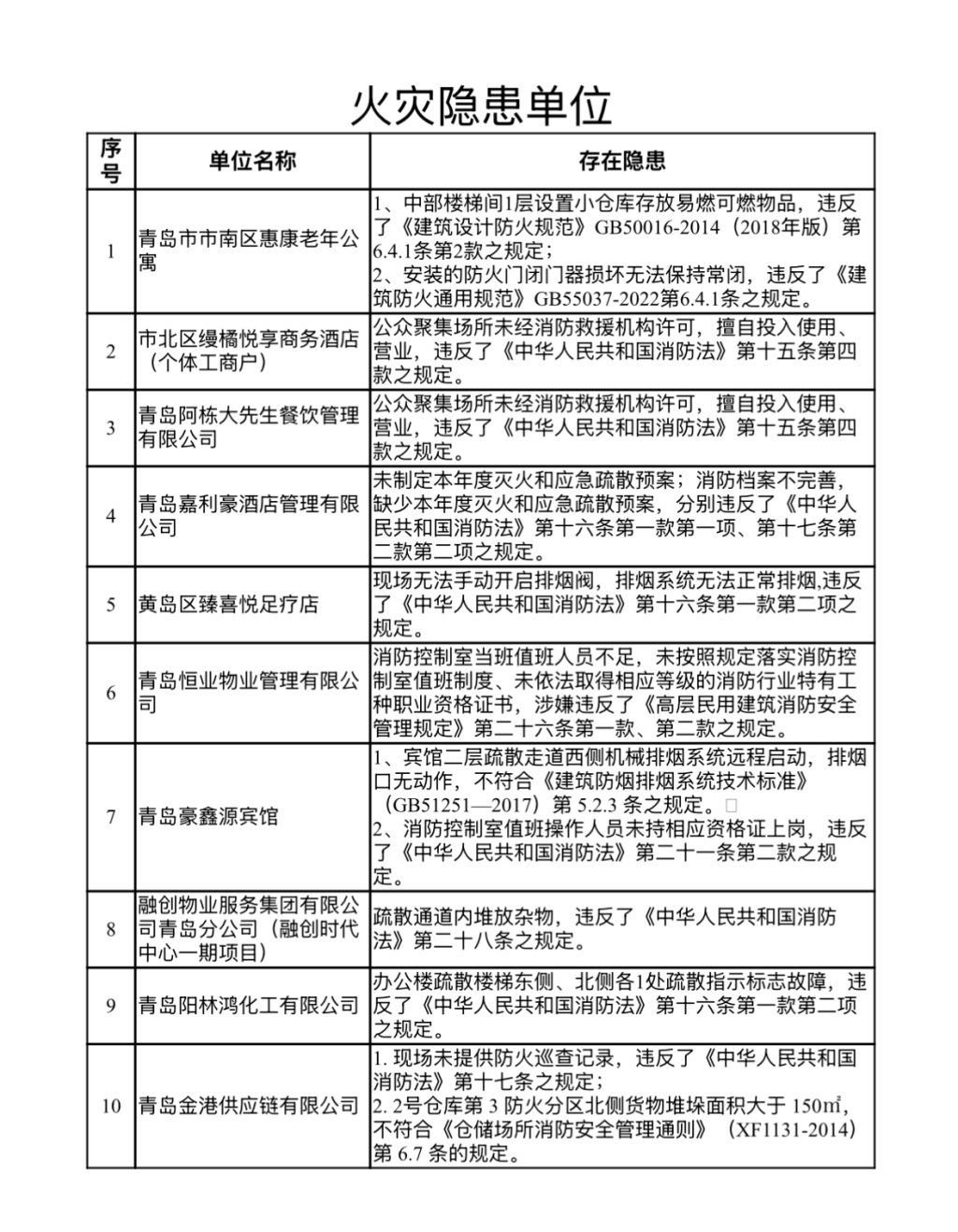 青岛消防曝光10家火灾隐患单位