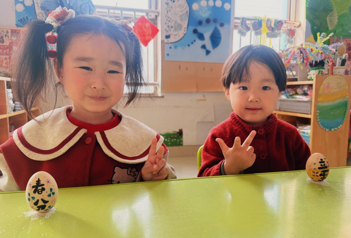 “春分到,蛋儿俏。”最热闹的要数彩绘春蛋和立蛋挑战了!孩子们拿起彩笔,为鸡蛋画上五颜六色的“春日新衣”,再小心翼翼地尝试让蛋宝宝站起来。一次次尝试,一次次探索,最后借助食盐小妙招,蛋稳稳地立在桌面上。春分立蛋的小游戏,摇身一变成了有趣的小科学实验,孩子们在好奇与专注中,收获了满满的成就感。