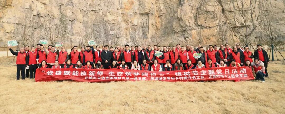 在历城区呼啸谷废弃矿坑探险公园,省勘院联合历城区自然资源局、历城城发集团开展植树活动,以党建联建推动生态修复,助力乡村振兴。