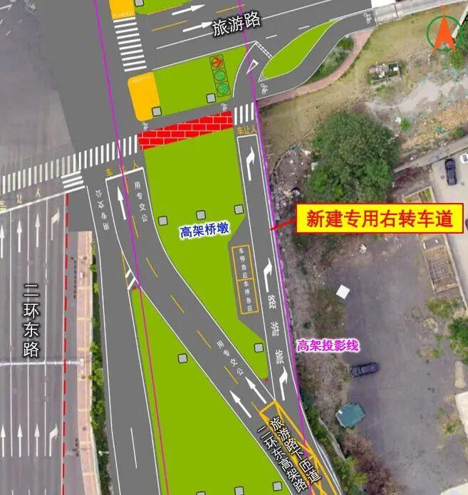 二环东高架路旅游路下匝道新增专用右转车道,有效打通瓶颈节点,实现了快慢交通的快速有序转换。