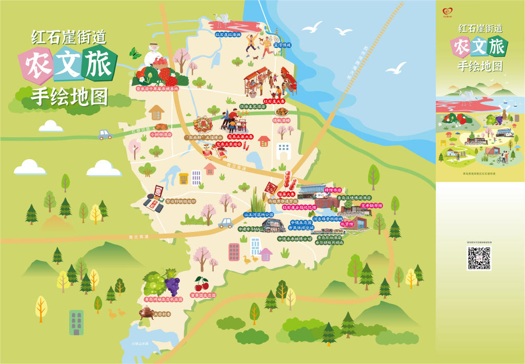 为给市民游客提供更优质的旅行体验,红石崖街道整合全域旅游资源,正式发布《红石崖街道农文旅手绘地图》。这份兼具实用性与收藏价值的地图,全景呈现了六大主题线路、27个不可错过的打卡点:从雷家店子草莓采摘基地到青岛鸿瑞生态农业园的“香飘四季·采摘美食之旅”;从红石崖红海滩、蓝湾慢道到山王河湿地公园的“绿意诗行·公园漫步之旅”;从大夼制香、马桂秀非遗剪纸到“聚鼎鲜”五福馒头的“匠心传承·非遗手造之旅”;从红石崖乡愁记忆馆、艺术钢琴馆到礼贤馆的“文脉寻踪·馆藏拾光之旅”;从龙泉王家庙会、福莱大集到红石崖大集的“烟火民俗·欢乐大集之旅”;从中建幸孚MALL、中德未来城博士邨到青岛汉德博阁酒店的“悦享食宿·休闲消费之旅”。六条线路串珠成链,全景展现了红石崖街道独特的文化底蕴与自然魅力。电子版上线“红心连万家”官方微信平台,实现一键收藏、随走随查。