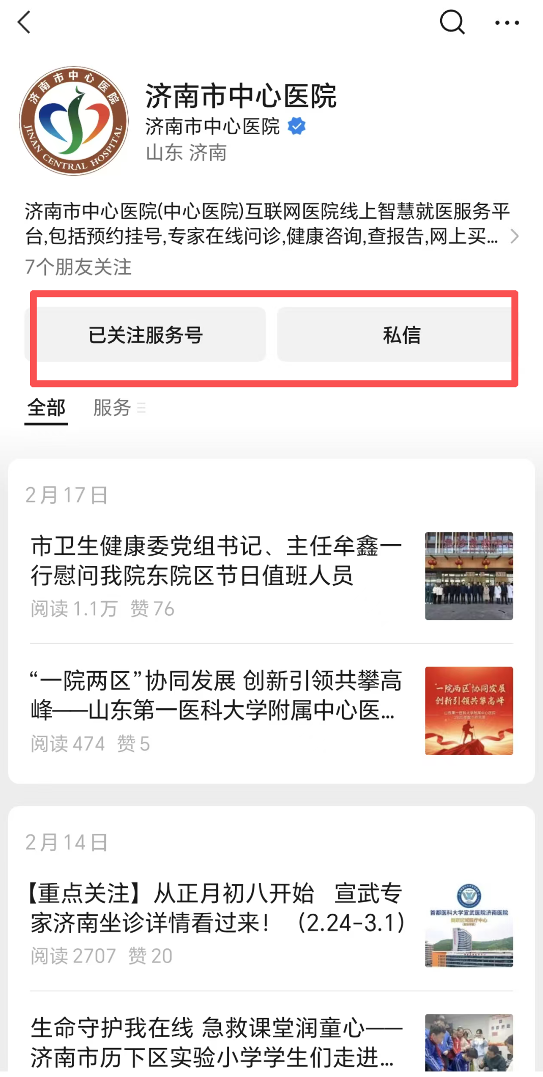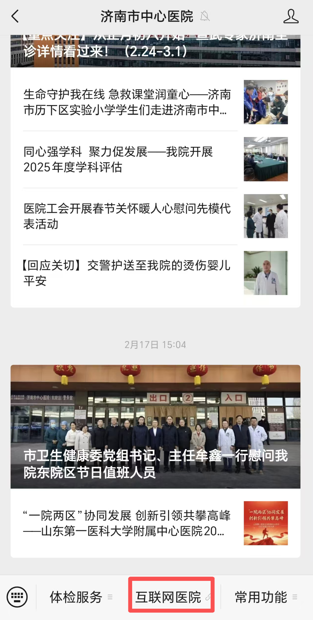 平台入口:扫码上方二维码或微信搜索并关注“济南市中心医院服务号”,点击下方菜单栏进入“互联网医院”。