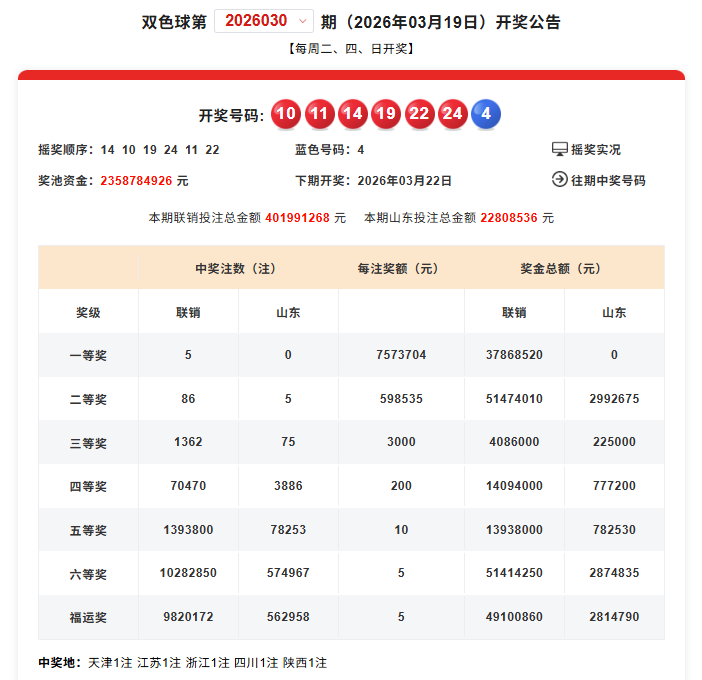 3月19日,双色球第2026030期开奖,当期销售4.01亿元,筹集公益金1.44亿元;中出一等奖5注,被天津、江苏、浙江、四川和陕西的彩友幸运分享,单注奖金757.37万元;中出二等奖86注,单注奖金59.85万元;中出“福运奖”982.01万注,奖金合计4910多万元。其中,山东中得“福运奖”56.29万注。