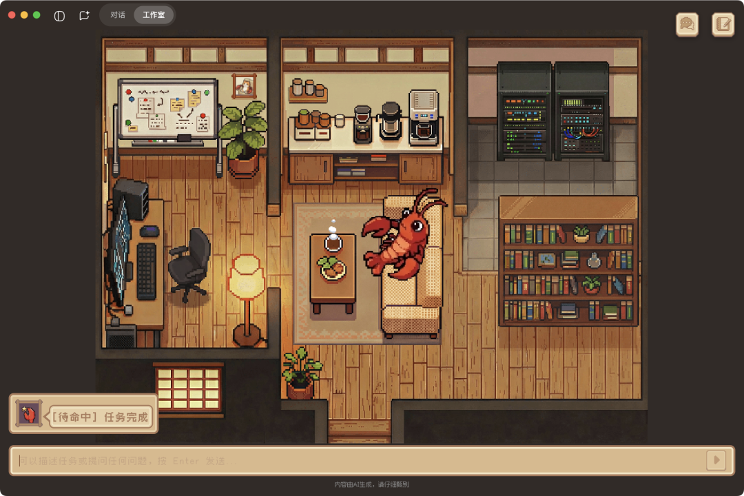 正式和大家介绍「像素工作室」。这个设计灵感来自开源项目 Star-Office-UI,QClaw 在与项目主创(海辛 @ring_hyacinth 和阿文 @simonxxoo)沟通后进行了相关探索与实现,将其落地为龙虾的专属空间。